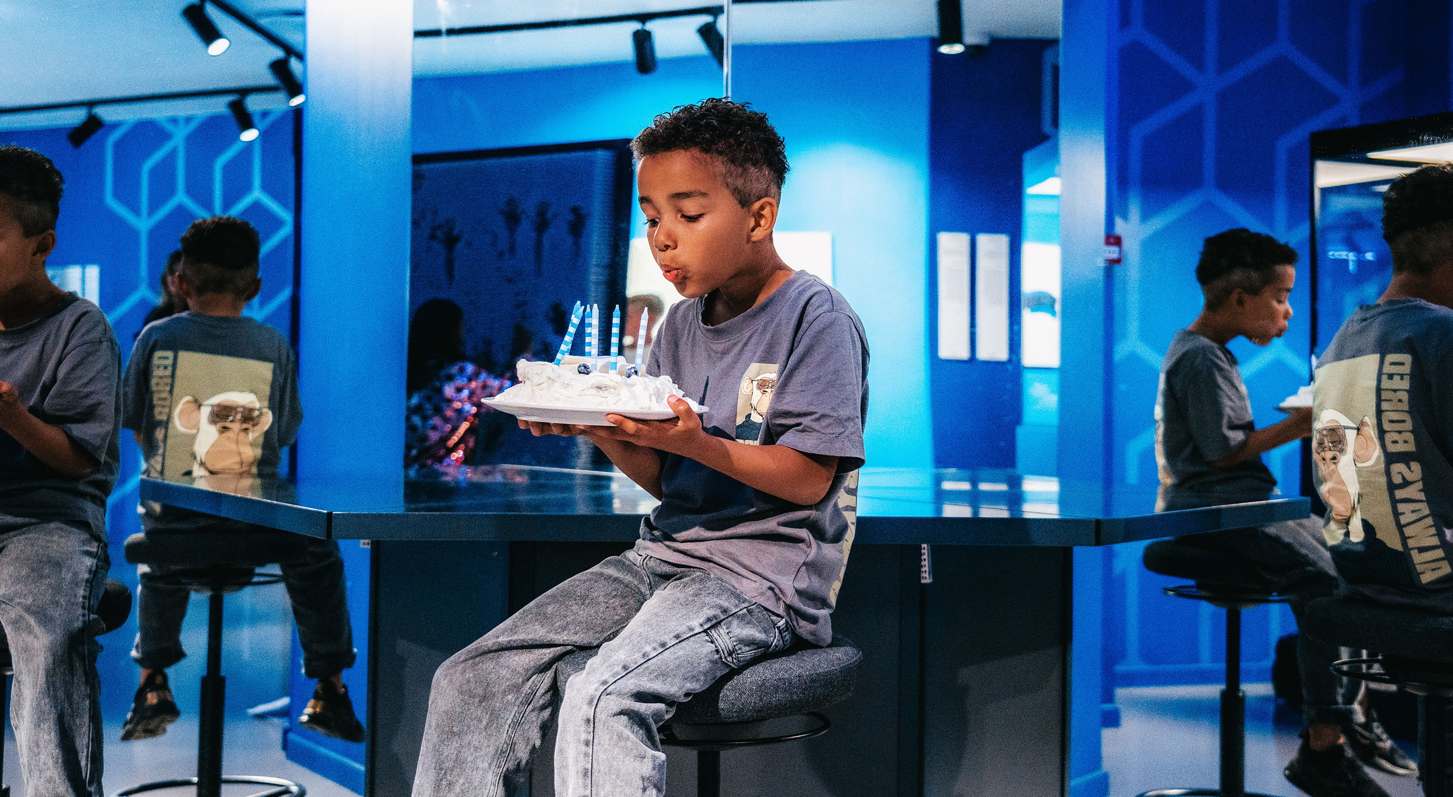 Our illusion rooms are the perfect backdrop for memorable birthday photos: pose as you defy gravity, reflect into infinity, or appear to grow or shrink.